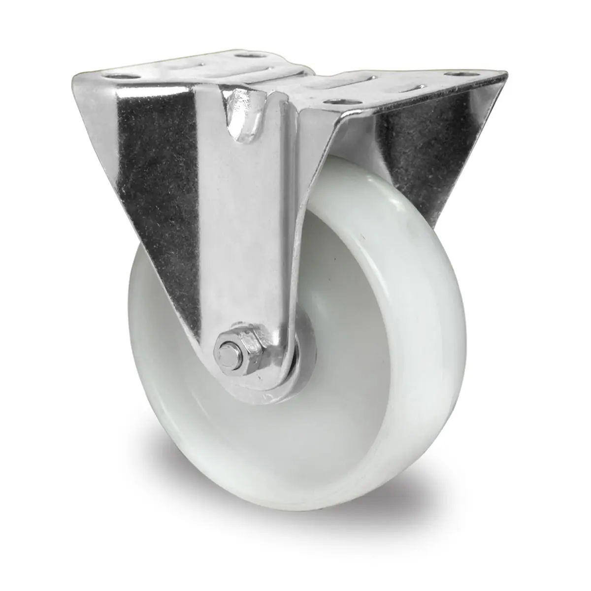 galvanisch verzinktes Stahlblechgehäuse, Befestigung per Anschraubplatte mit Lochbild 80 / 77 x 60 mm, Gehäuse mit Materialstärke 2.00 mm (Befestigung) und 2.00 mm (Gabel), Radfelge aus Polyamid weiß / Lauffläche aus Polyamid weiß, Nabenbreite 40 mm, Rollenlager, verschraubte Radachse (inkl. komplettem Achsmaterial), kleiner Metall-Fadenschutz