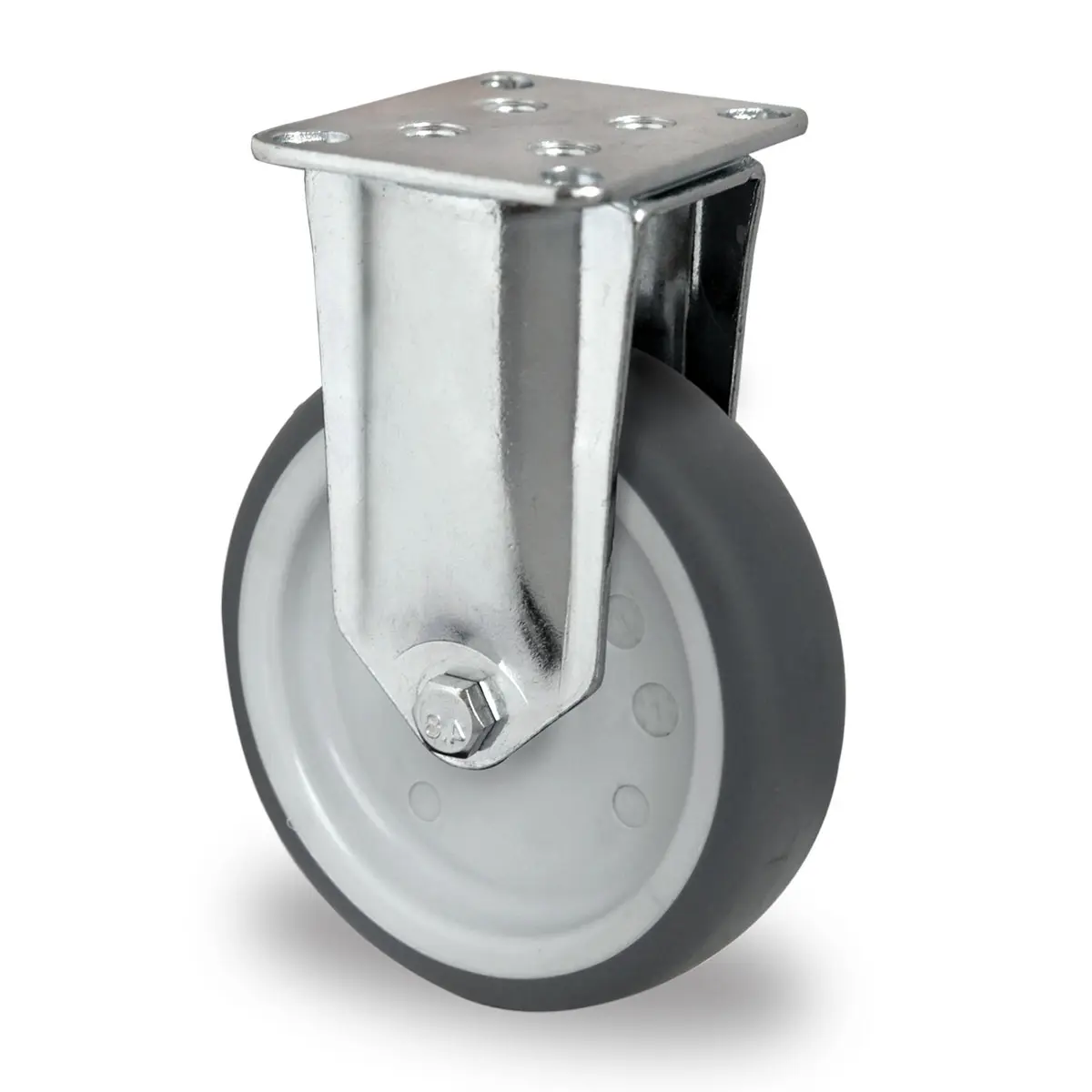 galvanisch verzinktes Stahlblechgehäuse, Befestigung per Anschraubplatte mit Lochbild 61.5 / 56 x 51.5 / 46.5 mm, Gehäuse mit Materialstärke 2.50 mm (Befestigung) und 2.50 mm (Gabel), Radfelge aus Polypropylen grau / Lauffläche aus Thermopl. Elastomer 95° Shore A grau, Nabenbreite 36 mm, Gleitlager, verschraubte Radachse (inkl. komplettem Achsmaterial), ohne separaten Fadenschutz