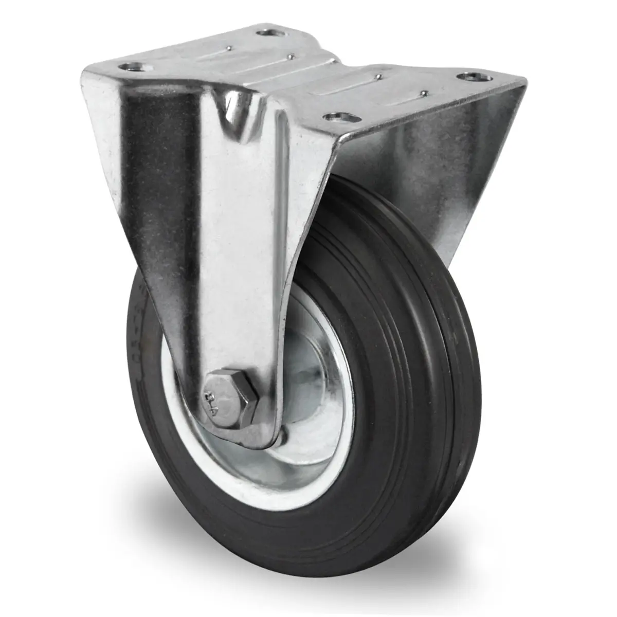 galvanisch verzinktes Stahlblechgehäuse, Befestigung per Anschraubplatte mit Lochbild 80 / 77 x 60 mm, Gehäuse mit Materialstärke 2.00 mm (Befestigung) und 2.00 mm (Gabel), Radfelge aus Stahlblech blau verzinkt / Lauffläche aus Vollgummi 85° Shore A schwarz, Nabenbreite 50 mm, Rollenlager, verschraubte Radachse (inkl. komplettem Achsmaterial), ohne separaten Fadenschutz