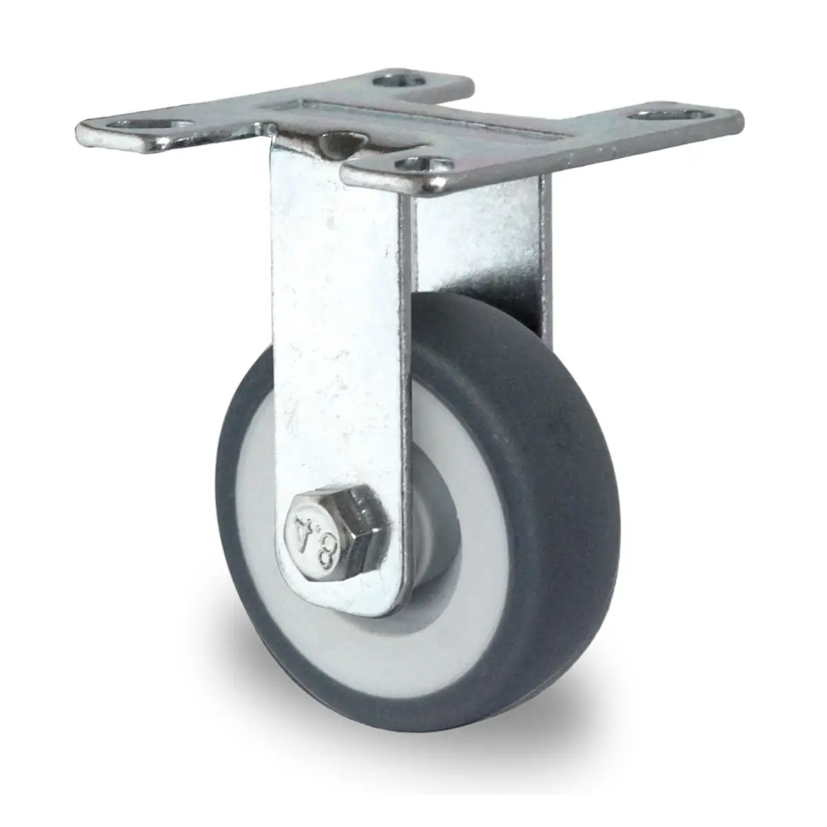 galvanisch verzinktes Stahlblechgehäuse, Befestigung per Anschraubplatte mit Lochbild 44 / 38.5 x 44 / 38.5 mm, Gehäuse mit Materialstärke 1.50 mm (Befestigung) und 1.50 mm (Gabel), Radfelge aus Polypropylen grau / Lauffläche aus Thermopl. Elastomer 95° Shore A grau, Nabenbreite 22 mm, Gleitlager, verschraubte Radachse (inkl. komplettem Achsmaterial), ohne separaten Fadenschutz