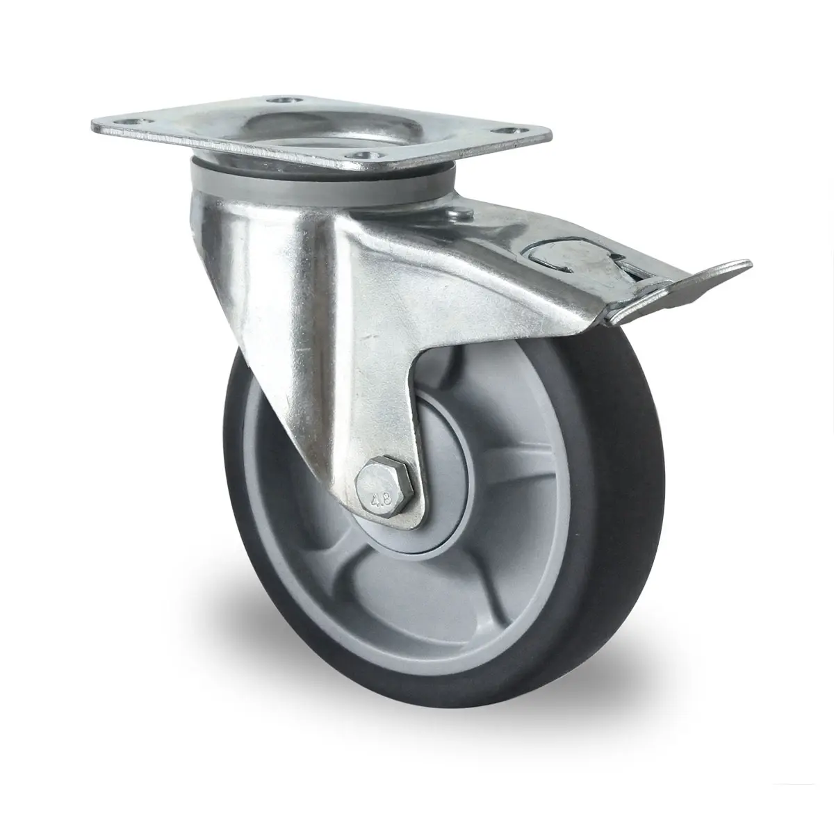 galvanisch verzinktes Stahlblechgehäuse, Schwenklager mit zweifachem Kugel-Drehkranz, Befestigung per Anschraubplatte mit Lochbild 80 / 77 x 60 mm, Gehäuse mit Materialstärke 2.50 mm (Befestigung) und 2.50 mm (Gabel), Radfelge aus Polypropylen grau / Lauffläche aus Thermopl. Elastomer 65 – 75° Shore A grau, Nabenbreite 40 mm, Kugellager, verschraubte Radachse (inkl. komplettem Achsmaterial), kleiner Kunststoff-Fadenschutz