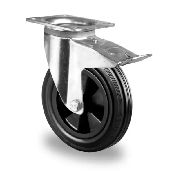 galvanisch verzinktes Stahlblechgehäuse, Schwenklager mit zweifachem Kugel-Drehkranz, Befestigung per Anschraubplatte mit Lochbild 105 x 84 / 76 mm, Gehäuse mit Materialstärke 3.50 mm (Befestigung) und 3.00 mm (Gabel), Radfelge aus Polypropylen schwarz / Lauffläche aus Vollgummi 85° Shore A schwarz, Nabenbreite 59 mm, Rollenlager, verschraubte Radachse (inkl. komplettem Achsmaterial), ohne separaten Fadenschutz