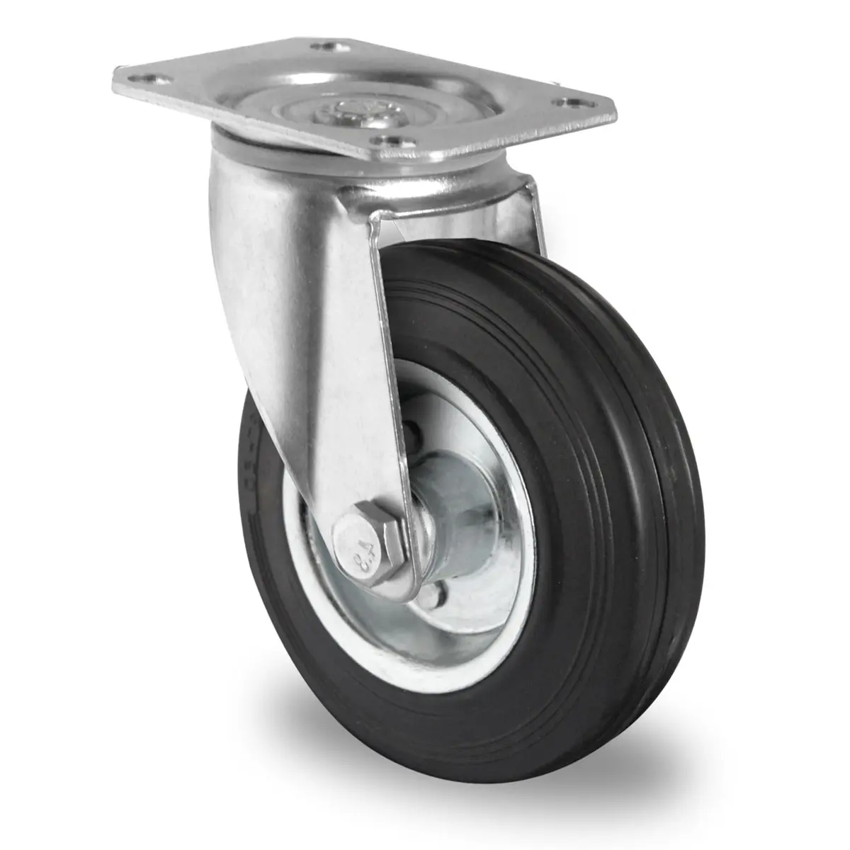 galvanisch verzinktes Stahlblechgehäuse, Schwenklager mit zweifachem Kugel-Drehkranz, Befestigung per Anschraubplatte mit Lochbild 105 x 84 / 76 mm, Gehäuse mit Materialstärke 3.50 mm (Befestigung) und 3.00 mm (Gabel), Radfelge aus Stahlblech blau verzinkt / Lauffläche aus Vollgummi 85° Shore A schwarz, Nabenbreite 59 mm, Rollenlager, verschraubte Radachse (inkl. komplettem Achsmaterial), ohne separaten Fadenschutz