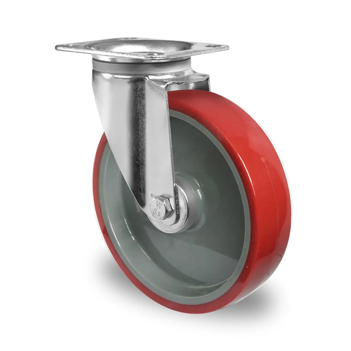 galvanisch verzinktes Stahlblechgehäuse, Schwenklager mit zweifachem Kugel-Drehkranz, Befestigung per Anschraubplatte mit Lochbild 105 x 84 / 76 mm, Gehäuse mit Materialstärke 4.00 mm (Befestigung) und 3.00 mm (Gabel), Radfelge aus Polyamid grau / Lauffläche aus Thermopl. Polyurethan 95° Shore A rot, Nabenbreite 59 mm, Rollenlager, verschraubte Radachse (inkl. komplettem Achsmaterial), kleiner Metall-Fadenschutz