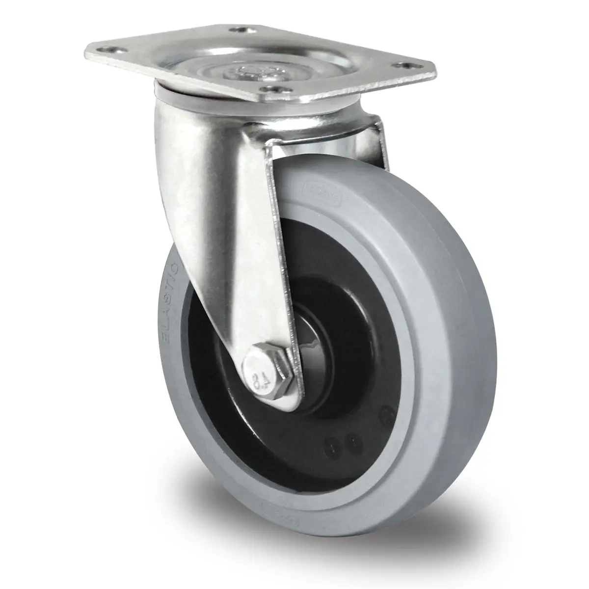 galvanisch verzinktes Stahlblechgehäuse, Schwenklager mit zweifachem Kugel-Drehkranz, Befestigung per Anschraubplatte mit Lochbild 80 / 77 x 60 mm, Gehäuse mit Materialstärke 3.00 mm (Befestigung) und 2.50 mm (Gabel), Radfelge aus Polyamid schwarz / Lauffläche aus Elastik 65° Shore A grau, Nabenbreite 40 mm, Kugellager, verschraubte Radachse (inkl. komplettem Achsmaterial), kleiner Kunststoff-Fadenschutz