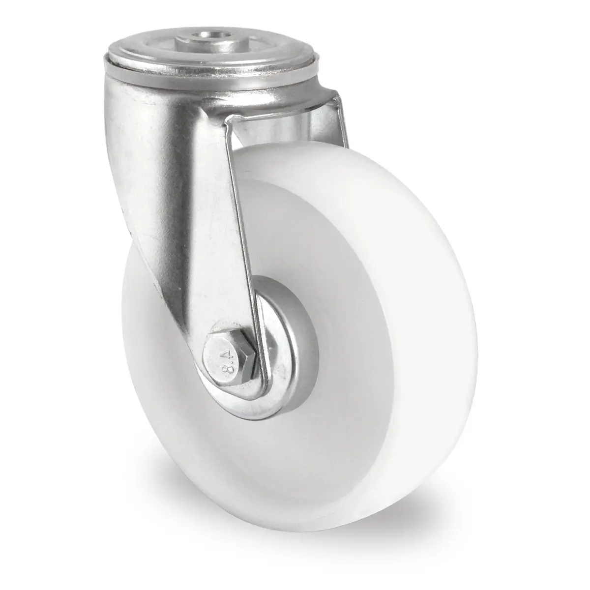 galvanisch verzinktes Stahlblechgehäuse, Schwenklager mit zweifachem Kugel-Drehkranz, Befestigung per Rückenloch ø 13 mm, Gehäuse mit Materialstärke 3.50 mm (Befestigung) und 3.00 mm (Gabel), Radfelge aus Polyamid weiß / Lauffläche aus Polyamid weiß, Nabenbreite 59 mm, Rollenlager, verschraubte Radachse (inkl. komplettem Achsmaterial), kleiner Metall-Fadenschutz